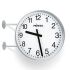 Innenuhr, rund, doppelseitig, Metallgehäuse, silbergrau-metallic (RAL 9006 weißaluminium), stabile Wandhalterung (Standardlänge ca. 210 mm), stoßgeschützte Kunststoffgläser (Acrylglas®XT). Weiße Metallzifferblätter mit schwarzen arabischen Zahlen, Zifferblattdruck nach DIN 41091. Schwarze DIN- Balkenzeiger für Stunden- und Minutenanzeige. Betriebsspannung über PoE (Power over Ethernet), entsprechende Hardware ist bauseits zu stellen.