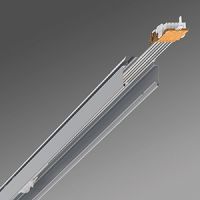 Die Tragschiene hat zwei Aufgaben: sie dient sowohl als stabile Montageschiene für die Lichtträger als auch als Gehäuse für die Stromversorgungskabel der einzelnen Einheiten. Alle Schienenabschnitte bestehen aus weiß oder silber lackiertem feuerverzinktem Stahl. Sie sind in speziellen TL5 Längen von 1, 2 und 3 Lichtträgern für 49 W (35 W, 80 W) und 54 W (28 W) lieferbar. Der Maxos LED Lichtträger 4MX850 491 wird ebenfalls mit diesen Tragschienen angewendet. In die Schiene sind ein (5- oder 7-adriges) oder zwei (2 x 5-adrige oder 2 x 7-adrige) Flachbandkabel integriert, so dass jederzeit in Verbindung mit einem integrierten Phasenwahlschalter und Anschlussblöcken eine sichere und korrekte Verkabelung möglich ist. Das 7-adrige Kabel dient zum Anschluss einer Lichtregelung oder Notbeleuchtung an die mit einem Notlicht-Akkupaket ausgestatteten Lichtträger. Doppelkabel (2 x 5- oder 2 x 7-adrig) werden benötigt, wenn die Lichtträger mit einer kompletten separaten Stromversorgung verbunden werden sollen. Sie kommen vor allem für Notbeleuchtungen über zentrale Notfallakkus oder separate Schaltvorgänge zum Einsatz. In diesen Fällen sind dann keine zusätzlichen Anschlussblöcke oder Kabel erforderlich. Bei hängenden Lichtbändern werden die Tragschienenabschnitte über den integrierten elektrischen Anschluss und ein robustes externes mechanisches Kupplungsstück (Zubehör) miteinander verbunden. An der Decke montierte Lichtbänder nutzen den gleichen integrierten elektrischen Anschluss und eine interne Kupplung (Zubehör). Die Kabel lassen sich je nach Bedarf durch spezielle Ausbrechöffnungen im oberen Bereich des Schienenabschnitts führen. Die Tragschiene wird mit einer kompletten Reihe an austauschbaren Komponenten geliefert, so dass sie sich sehr flexibel anbringen lässt. Die ausgezeichnete Stabilität der Abschnitte und Kupplungen erlaubt Befestigungsabstände von 3,4 bis 5 Metern. Das Grundzubehör für Maxos TL-D / LED Tragschienen kann auch für TL5 / LED Tragschienen verwendet werden.