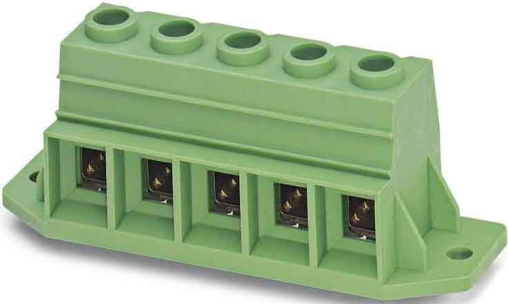 Leiterplattenklemme, Nennstrom: 125 A, Bemessungsspannung (III/2): 1000 V, Nennquerschnitt: 35 mm², Anzahl der Potenziale: 5, Anzahl der Reihen: 1, Polzahl pro Reihe: 5, Artikelfamilie: MKDSP 25/..-F, Rastermaß: 15 mm, Anschlussart: Schraubanschluss mit Zughülse, Schraubenangriffsform: Z2L Pozidriv mit Längsschlitz, Montage: Wellenlöten, Anschlussrichtung Leiter/Platine: 0 °, Farbe: grün, Pin-Layout: Lineares Pinning, Pinlänge [P]: 4,5 mm, Anzahl der Lötpins pro Potenzial: 4, Verpackungsart: verpackt im Karton. Dauerhafte mechanische Belastungen der Klemme sind zu vermeiden