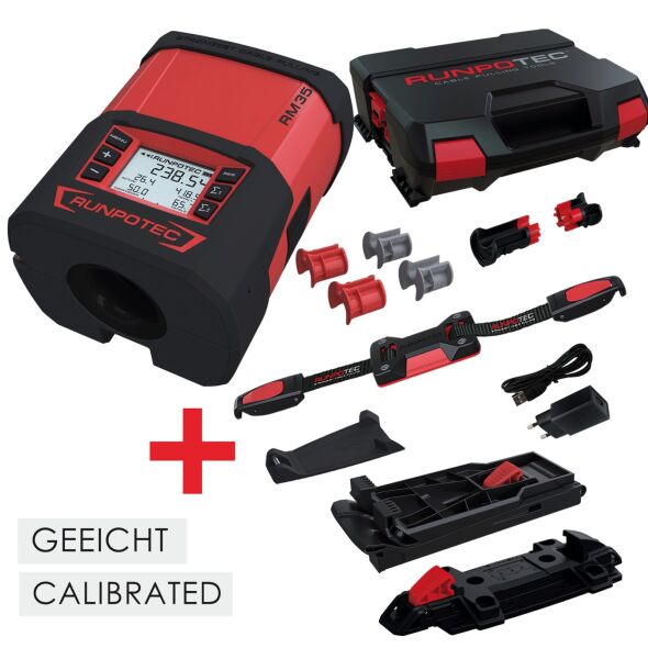Der RM35 - GEEICHT ist ein digitales Kabellängenmessgerät mit dem Kabel, Einzeladern, Seile, Rohre oder Schläuche mit einem Durchmesser von Ø 2 mm bis Ø 32 mm exakt gemessen werden können. Er ist spritzwasser- und staubgeschützt, extrem stoßfest und somit bestens für die Baustelle geeignet. Der RM35 verfügt über 2 Summentasten mit denen Messwerte fortlaufend summiert werden können. Ebenfalls ist eine Countdownfunktion inkludiert, mit der vorgegebene Kabellängen gemessen werden können. Der RM35 ist mit einem Lithium-Ionen-Akku mit extrem langer Laufzeit (Dauerbetrieb 100 Std. - ohne Hintergrundbeleuchtung) ausgestattet. Der Akku kann über die integrierte USB-C Ladebuchse aufgeladen werden. Perfekt verstaut ist der RM35 im RUNPOTEC Systemkoffer, welcher auch Sortimo kompatibel ist. Mit dem Gurt mit Clipsystem kann der RM35 an das XB300, XB 500 oder XB500 T Kabelabrollsystem einfach verbunden werden. Die Länge des Gurtes lässt sich von 750 mm bis 1200 mm einstellen. Alternativ kann dieser Gurt mit dem Ankerpad verbunden werden, somit bietet er eine Fixiermöglichkeit an alle herkömmlichen Abrollsysteme. ANWENDUNGSFILM: Einen kurzen, sehr informativen Anwendungsfilm können Sie durch Scannen des QR-Codes oder auf www.runpotec.com ansehen. Lieferumfang: 1 x RM35 digitales Kabellängenmessgerät - geprüft nach MODUL F, 1 x Prüfzertifikat, 1 x Gurt mit Clipsystem 1200 mm, 1 x Ankerpad,1 x Montageplatte RM35, 1 x Montageplatte-Systemkoffer, 2 x Führungsbacken grau (Ø 12 mm / 18 mm), 2 x Führungsbacken rot (Ø 6 mm / 24 mm), 1x Multibacken RM35 rund, 1 x USB-C Ladekabel, 1 x EURO-Netzstecker, 1 x RUNPOTEC Systemkoffer