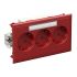 CYB-PS SCHNELMONTAGE 3-V ROOD. Alle CYB-steckdosen verfügen über einen erhöhten Berührungsschutz. Die Master- und Slave-Steckdosen werden ohne Dose eingebaut. Dieses System besteht aus einer Dreifach-Master-Steckdose, die mit einer beliebigen Anzahl von Zweifach-Slave-Steckdosen erweitert werden kann. Die Kombination wird mit einem Endstück abgeschlossen, das einfach zwischen die Seite der Steckdose und die Frontabdeckung eingesteckt wird. Kennzeichnung, Abschluss und Zugentlastung werden an der Mastersteckdose vorgenommen.