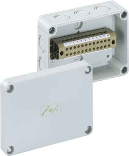 Reihenklemmengehäuse, mit Schutzart IP54/IP66, Nennquerschnitt 4mm², Ui=400V AC, Polystyrol, innenliegende Befestigungsstellen, für Standardinstallationen im Innenbereich, bestückt mit 12-polige Blockklemme 4mm² (Typ Contaclip BKA 4)