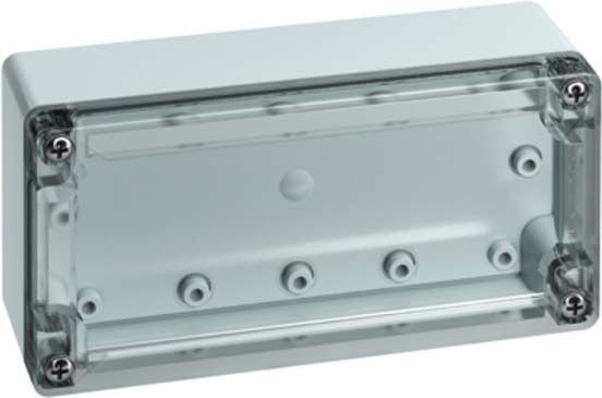 Leergehäuse, mit Schutzart IP66/IP67, Polycarbonat, zertifiziert durch UL (UL 508 & CSA C22.2 No. 14-13, UL 50 & CSA 22.2 No. 94.1-7 & UL 50E & CSA C22.2 No. 94.2-7), DLG (Ammoniakbeständigkeit), Ui=690V AC, Ui=1000V DC, innenliegende Befestigungsstellen, für Installationen im industriellen Umfeld und geschütztem Außenbereich, mit Schnellverschluss, Kasten: Polycarbonat, grau, Deckel: Polycarbonat, transparent, glatte Seitenwände