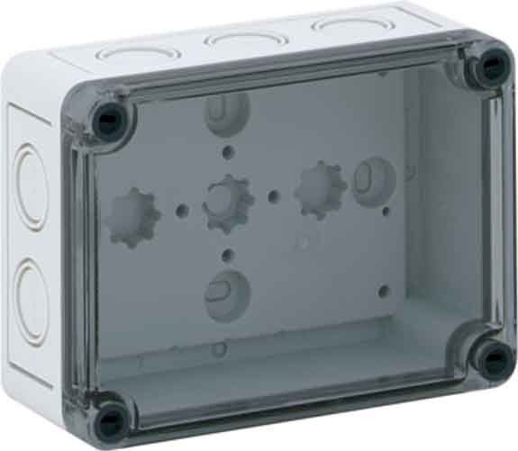 Leergehäuse, mit Schutzart IP66, Polystyrol, Ui=690V AC, Ui=1000V DC, innenliegende Befestigungsstellen, für Standardinstallationen im Innenbereich, Kasten: Polystyrol, grau, Deckel: Polycarbonat, transparent, Ausschlagmembranen, M16/M20, (10 seitlich)