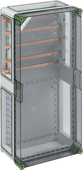Sammelschienengehäuse, Industrie Qualität, 5-polig, 250 A, mit CU-Schienen, L1...L3: 12 x 10mm, N: 12 x 10mm, PE: 12 x 10mm, ohne Klemmen, zur individuellen Bestückung, 4 x Gehäuseverbinder (GGV), mit transparentem Deckel