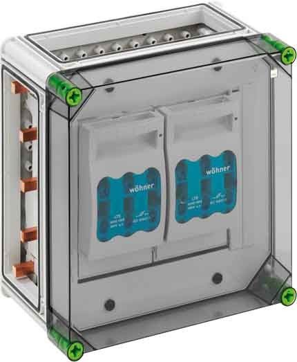NH-Reiter-Sicherungs-Lasttrennschaltergehäuse, Industrie Qualität, 2 x NH 00-Reiter-Sicherungs-Lasttrennschalter, Schellenanschluss 1,5-50mm², Abgang universal, auf Sammelschiene 5-polig, N-Klemmen 4-35mm², PE-Klemmen 4-35mm², 3 x Gehäuseverbinder (GGV), auf Sammelschienensystem 250 A, mit transparentem Deckel