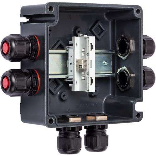 Klemmenkasten Ex e, explosionsgeschützt, Typ: 8118/132-149-0, Bemessungsbetriebsspannung AC: 440 V, Anschlussquerschnitt: 4 mm2, Gehäusematerial: Polyesterharz, glasfaserverstärkt, Gehäuse Farbe: dunkelgrau, Abmessungen (B x H x T): 145 x 145 x 71 mm, Einsatzbereich (Zonen): 1, Gasexplosionsschutz :, II 2 G Ex eb IIC T6....T5 Gb, Staubexplosionsschutz :, II 2 D Ex tb IIIC T80 °C ....T95 °C Db, Umgebungstemperatur °C: -55 .... +40 °C, Silikonfrei: Nein, 1 ST WAGO 221-482 2-Leiter 4 mm2 lichtgrau, 1 ST Tragschiene 35 x 120 mm, 6 ST 8161/7-M25-1707-LT mit Stopfen, Für weitere Info siehe: r-stahl.com Webcode 8118D