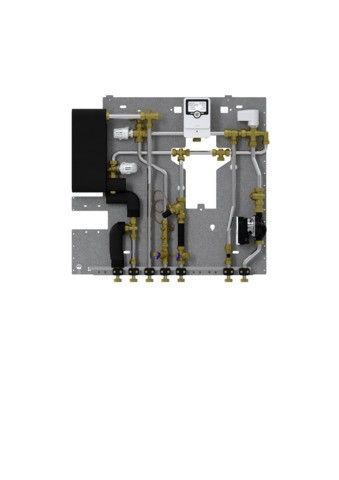Darüber hinaus sind bereits integriert: ein elektronisch geregelter, gemischter Heizkreis mit separater Regelung, eine Umwälzpumpe, ein Stellmotor und ein Ventilkörper. Alle Komponenten sind über eine Edelstahlverrohrung mit Messing-Verbindungsstücken verbunden.