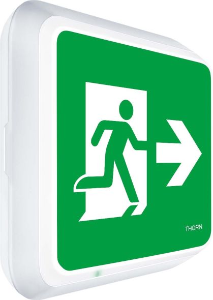 Eine schlanke, quadratische LED-Rettungswegkennzeichnung zur Anbaumontage. Leuchte mit Einzelbatterieversorgung für 1 h Notlichtbetrieb in Dauer- oder Bereitschaftsschaltung, automatischer Test (Autotest) durch die Leuchte, optional zentrales Monitoring über DALI, Anzeige des Leuchtenstatus über Status-LED. NFC-Schnittstelle für Adressierung, Konfiguration und Wartung per PROset Pen (Artikelnr.: 22170290) oder PROset-App. Adressierung alternativ auch visuell oder per EZ-Adressierung möglich. Dauer- oder Bereitschaftsmodus einstellbar über Jumper und NFC-Schnittstelle (für Autotest-Leuchten, muss bei Leuchten mit DALI-Steuerung über das System erfolgen). Netzanschluss: 220-240 Vac (+/- 10 %), 50/60 Hz. Gehäuse: Polycarbonat (PC) einspritzgegossen, weiß (RAL 9016). Diffusor: Polycarbonat (PC), opal, mit geklebtem, gedrucktem Richtungspfeil (rechts) als Notausgangspiktogramm gemäß ISO 7010. Einheitliche Rückbeleuchtung des Piktogramms, Leuchtdichte > 500 cd/m² in der Weißregion und durchschnittlich 200 cd/m² im Netzbetrieb (gemäß DIN 4844), mindestens 2 cd/m² im Notlichtmodus (gemäß EN 1838). Sichtweite gemäß EN 1838: 44 m. Schutzklasse II, IP65, Schlagfestigkeit: IK10. Umgebungstemperatur: 0°C bis +35°C. Zur direkten Wandmontage geeignet. Durchgangsverdrahtung ist mit Kabeln von bis zu 2,5 mm² möglich. BESA-kompatibel. Lithium-Eisenphosphat-Akku (LFP) mit drei Jahren Garantie. Zertifizierung über Lebensmitteltauglichkeit (zur Verwendung in Bereichen mit vollständig verpackten Lebensmitteln). Leuchte mit halogenfreien und silikonfreien Kabeln verdrahtet. Leuchte mit D-Symbol (zur Verwendung in Bereichen, in denen eine Ansammlung von leitfähigem Staub auf der Leuchte zu erwarten ist). Autarke Notlichtleuchten benötigen langlebige Akkus. Thorn Akkus sind robust und verfügen über eine 3-Jahresgarantie. (Gültig gemäß den Bestimmungen der ebenfalls gültigen Herstellergarantie auf Thorn-Produkte und in dem darin festgelegten Umfang, die Herstellergarantie ist einsehbar unter http://www.thornlighting.com/en/products/5-year-guarantee/5-year-warranty/terms-of-guarantee_en.pdf. Die Akkugarantie ist ungültig, wenn der Akku erst drei (3) Monate nach Lieferung EXW (Incoterms 2010) installiert wird.) Abmessungen: 277 x 277 x 58 mm Leuchten Leistung: 5 W Gewicht: 1,15 kg