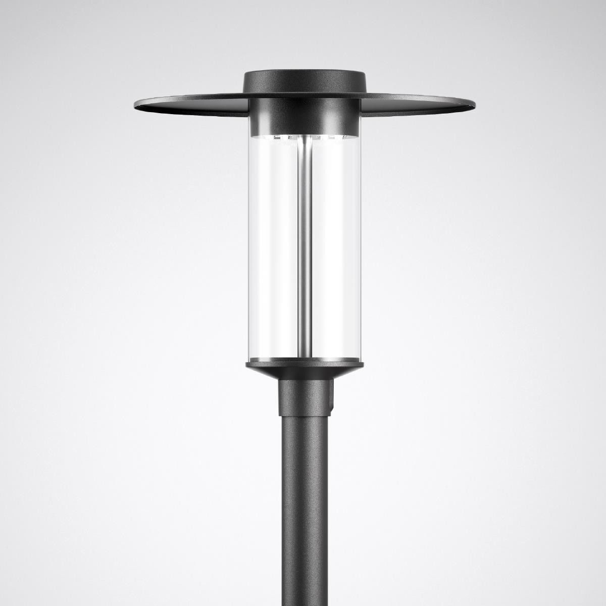 Dekorative Mastaufsatzleuchte in Zylinderform mit Aufsatzdach. Mit intelligentem Label zum schnellen Aufrufen von Leuchten-Informationen mittels QR-Code. Mit Leistungsreduzierung über Steuerphase. Das Abschalten einer Steuerphase bewirkt eine Einstellung des Leuchtenlichtstroms auf 50 %. Passender Mast auf Anfrage. In MLT-Ausführung (Multi-Lens-Technologie), bestehend aus hocheffizienten, UV- und temperaturbeständigen Linsensystemen in Vierfachanordnung. Mit asymmetrisch breit strahlender Lichtstärkeverteilung. Zur Beleuchtung von Straßen nach P-Beleuchtungsklassen. Zur flexiblen Anpassung an kundenspezifische Beleuchtungsaufgaben stehen weitere Abstrahlcharakteristiken zur Verfügung. Der nachträgliche Einbau einer rückseitigen / seitlichen Abschirmung ist als separat zu bestellendes Zubehör möglich. Leuchtenlichtstrom und Lichtfarbe fest eingestellt, mit Lichtstromkonstanthaltung am Ende der Lebensdauer (CLO). Bemessungslichtstrom 1200 lm, Bemessungsleistung 11 W, maximale Leuchten-Lichtausbeute 109 lm/W. Lichtfarbe warmweiß, ähnlichste Farbtemperatur (CCT) 3000 K, allgemeiner Farbwiedergabeindex (CRI) Ra > 70. Farborttoleranz (initial MacAdam) = 5 SDCM. Weitere LED-Lichtfarben auf Anfrage verfügbar. Die Lichtquelle ist entsprechend der Ökodesign-Anforderungen (VO (EU) 2019/2020) austauschbar. Leuchtenkörper aus Aluminium-Druckguss. Leuchtendächer aus korrosionsbeständigem Aluminium. Oberfläche anthrazit beschichtet (ähnlich DB 703). Seewetter geeignete Beschichtung auf Anfrage. Abschlusswannen aus hochschlagzähem PMMA, klar. Leuchtendurchmesser Ø 600 mm, Leuchtenhöhe 605 mm Mast auf Anfrage erhältlich. Schutzklasse (EN 61140): II, Schutzart (DIN EN 60529): IP65, Stoßfestigkeitsgrad nach IEC 62262: IK10. Zulässige Umgebungstemperatur (ta): 35 °C bis . Windangriffsfläche fw 0,120 m2. Gewicht: 8,0 kg. Mit montierter Anschlussleitung 6 m. Mit elektronischem Betriebsgerät, schaltbar. Das Betriebsgerät ist entsprechend der Ökodesign-Anforderungen (VO (EU) 2019/2020) austauschbar. Stoßspannungsfestigkeit Differential Mode / Common Mode: 6 kV / 10 kV. Das Produkt erfüllt die grundlegenden Anforderungen der anwendbaren EU-Richtlinien und des Produktsicherheitsgesetzes und trägt die CE-Kennzeichnung. Zusätzlich ist die Leuchte durch eine unabhängige Prüfstelle ENEC-zertifiziert. Leuchte 10 Jahre, Ersatzteile (LED-Modul, Betriebsgerät, optisches System) 15 Jahre nach Rechnungsdatum unter Vorbehalt vertretbarer Änderungen, die dem Fortschritt dienen, verfügbar.