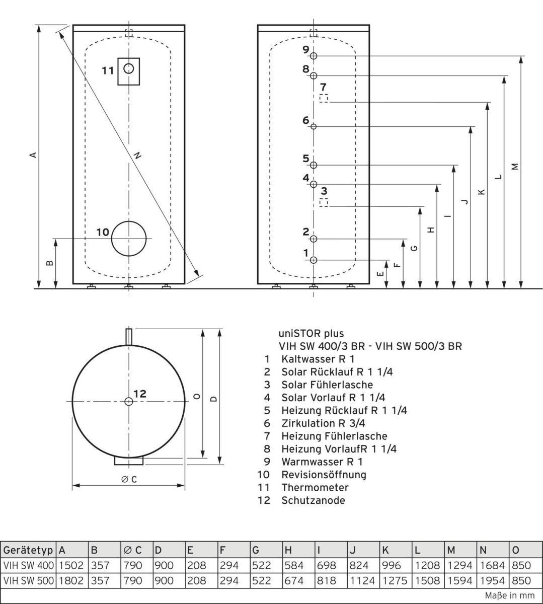 uniSTOR plus VIH SW 500/3 BR Solar-Warmwasserspeicher, rund, stehend, für solarunterstützte Warmwasserbereitung und Kombination mit Wärmepumpen Produktvorteile: Bivalenter Warmwasserspeicher, indirekt beheizt, Glattrohrregister mit großer, speziell für Wärmepumpen ausgelegter Wärme- übertragungsfläche, Trinkwasserseitig (Speicher und Rohr- wendel mit hochwertiger Emailierung Ausstattung: Speicher mit fest aufgeschäumter Wärmedämmung, Abnehmbarer Speichermantel, 2 Rohrwendelwärmetauscher, Reinigungsöffnung / Flansch für E-Heizstab, Zirkulationsanschluss, Magnesium-Schutzanode, Analoge Speichertemperaturanzeige, Transportlaschen beiliegend Speicherinhalt: 456 l Inhalt heizungsseitig: 28,9 l Inhalt solarseitig: 13,5 l zul. Betriebsüberdruck: 10 bar Heizwassertemperatur max.: 110 Grd.C Warmwassertemperatur max.: 85 Grd.C WW-Dauerleistung: 1530 l/h (62 kW) bei Heizungsvorlauf 60 Grd.C und Zapfstellentemperatur 45 Grd.C WW-Ausgangsleistung: 330 l/10 min bei Speichertemperatur 60 Grd.C und Zapfstellentemperatur 45 Grd.C Wärmetauscherfläche Heizung: 4,42 m2 Wärmetauscherfläche Solar: 2,07 m2 Vor-/Rücklaufanschluss R 5/4 Kalt-/Warmwasseranschluss R 1 Zirkulationanschluss R 3/4 Produktmaße: Höhe/Breite/Tiefe 1502/790/900 mm Kippmaß 1954 mm Gewicht 249 kg Jahreszeitbedingte Warmwasserbereitungs- Energieeffizienzklasse B (Spektrum A+ bis F)