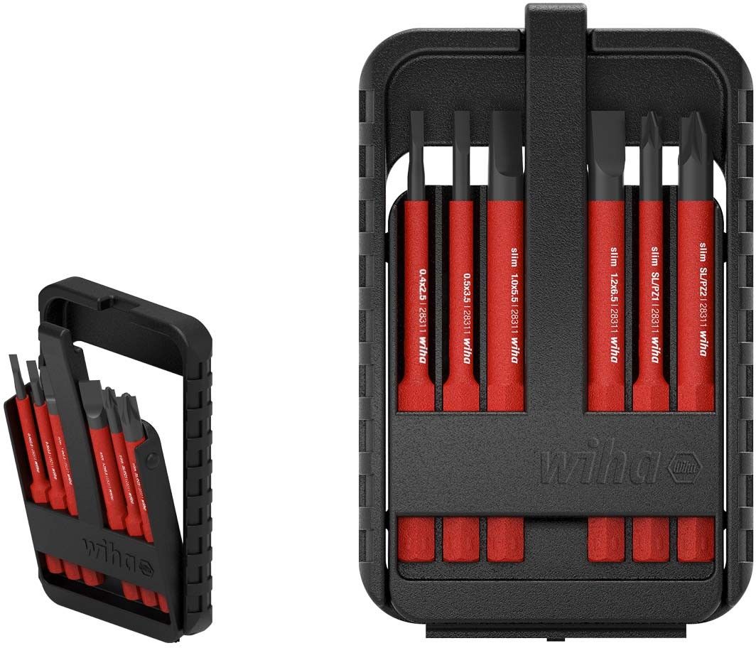 Erleichtert die Handhabung: Kompakte slimBit Box mit optimaler Einsicht auf die Profile und einfachem Zugriff. Bietet Ihnen vollen Schutz: Jedes Werkzeug einzeln bei 10.000 V AC getestet und zugelassen für 1.000 V AC. Erhöht Ihre Sicherheit: Wiha slimBits gewährleisten einen guten und geschützten Zugang zu tief liegenden Schrauben. Anwendung: Geeignet zum Verschrauben im Bereich von spannungsführenden Teilen bis 1.000 V AC, insbesondere im mobilen Einsatz. Um tiefliegende Schrauben erreichen zu können, ist der Klingendurchmesser bei herkömmlichen Elektrikerschraubendrehern häufig zu groß. Das Entfernen der Isolierung ist jedoch unzulässig und gefährdet zudem die eigene Sicherheit. Bei der speziell für elektrische Anwendungen entwickelten Wiha slimTECHNOLOGY wurde die Schutzlisolation in die Klinge intergriert, um bis zu 33% schlankere Klingen zu ermöglichen. So können mit den slimBits auch tiefliegende Schraub- und Federelemente mühelos erreicht werden. Die isolierten slimBits werden gemäß der internationalen Norm IEC 60900 einer Stückprüfung unterzogen und ermöglichen ein sicheres Arbeiten im Bereich von spannungsführenden Teilen bis 1.000 V AC. Zudem sind die slimBits in einer smarten Bitbox verstaut, welche eine optimale Einsicht auf die Schraubprofile gewährt. Die 6 mm slimBits sind nur im speedE®, slimVario® oder TorqueVario®-S electric Werkzeugen zu verwenden. Die 6 mm slimBits sind nur im speedE®, slimVario® oder TorqueVario®-S electric Werkzeugen zu verwenden. Geprüft gemäß IEC 60900. Inhalt: 1x Bit slimBit electric TX PLUS® 6IP x 75 mm (43144) 1x Bit slimBit electric TX PLUS® 7IP x 75 mm (43145) 1x Bit slimBit electric TX PLUS® 8IP x 75 mm (43146) 1x Bit slimBit electric TX PLUS® 9IP x 75 mm (43147) 1x Bit slimBit electric TX PLUS® 10IP x 75 mm (43148) 1x Bit slimBit electric TX PLUS® 15IP x 75 mm (43149) 1x slimBit-Box