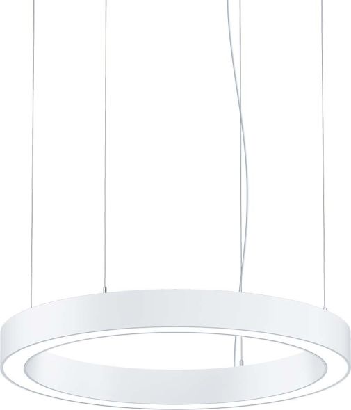 Ringförmige, direkt/indirekt strahlende LED Pendelleuchte, mit schlankem Aluminium Profilgehäuse in Farbe weiß und Opal Optik. Leuchten Leistung: 63,1 W, DALI steuerbare Leuchte mit LED-Konverter, LED-Lebensdauer 50000 h bis zu einem Lichtstromrückgang auf 90 % des Anfangswertes. Farborttoleranz (initial MacAdam): 3. Leuchten Lichtstrom: 6071 lm, Leuchten Lichtausbeute: 96 lm/W. Farbwiedergabe Ra > 90, Farbtemperatur 3000 K. Lichtlenkung über opale-Optik mit Mehrschichtaufbau für definierte Auskopplung mit UGR < 22. Gehäuse aus gerolltem Aluminiumstrangpressprofil, nahtlos verschweißt, weiß pulverbeschichtet für ein hochwertiges Oberflächenfinish, Abhängeseile und Montagezubehör werden mitgeliefert, Deckenbaldachin ist separat zu bestellen. Leuchte halogenfrei verdrahtet. Länge Abhängeseile: 3m. Glühdrahtprüfung: 650°C, Leuchte halogenfrei und silikonfrei verdrahtet, Abmessungen: Durchmesser 800 x 85 mm, Gewicht: 6 kg.